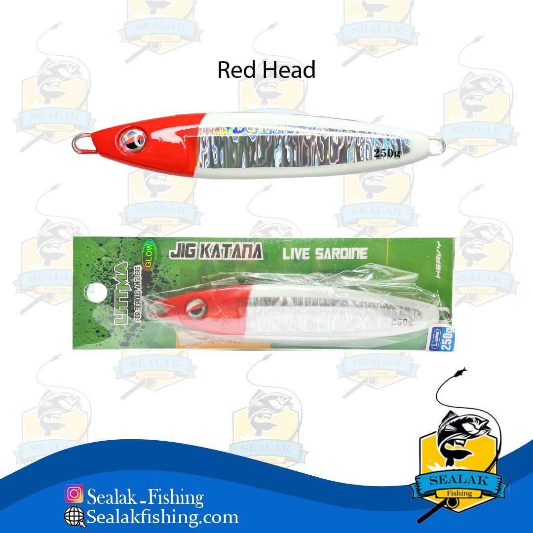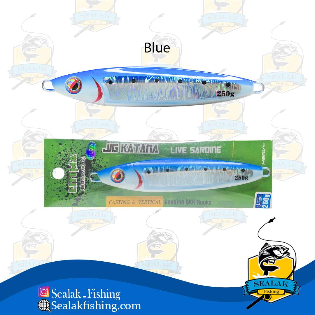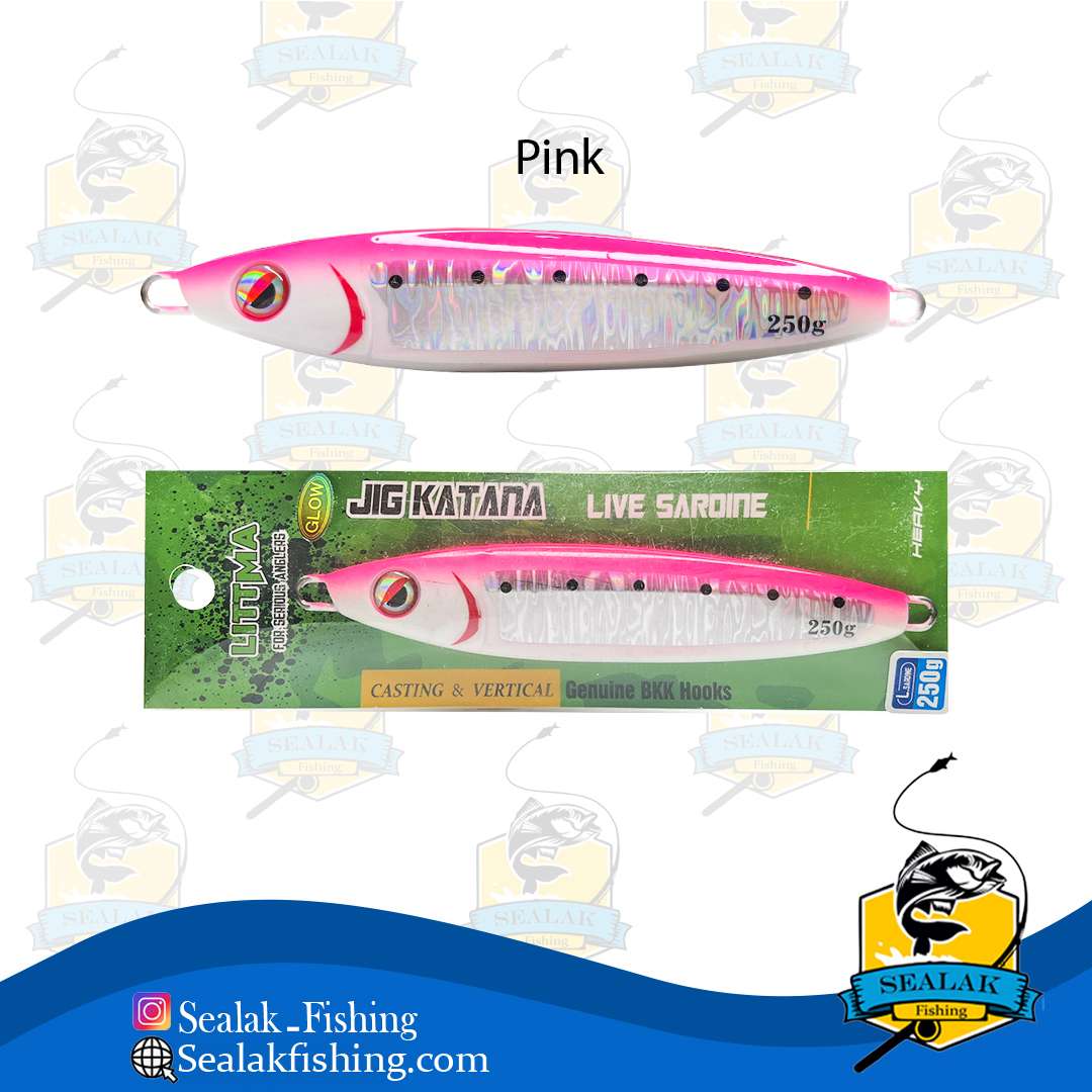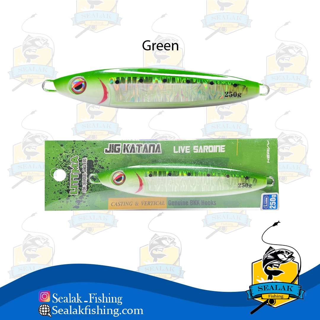 این محصول به صورت تخصصی برای ماهیگیری به صورت افقی طراحی شده که با توجه به شکل خاص خود به سرعت در آب فرو می رود و ماهیگیر می تواند در کمترین زمان ممکن آن را در عمق مورد نظر خود قرار دهد . علاوه بر شکل خاص ، وزن 250 گرمی آن ، عمل فرو روندگی جسگ را بهبود می بخشد . جیگ کاتانا در چهار رنگ بسیار پرکاربرد و پر طرفدار در بین ماهیگیران ، شامل آبی ، سبز ، صورتی و کله قرمز عرضه شده است . این رنگ ها دارای درخشش خوبی هستند که در جذب ماهیان عملکرد بالایی از خود نشان خواهند داد .