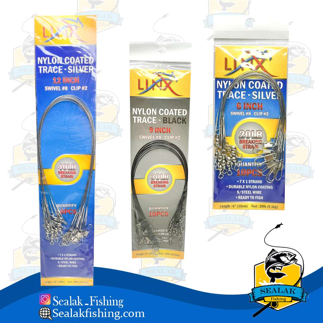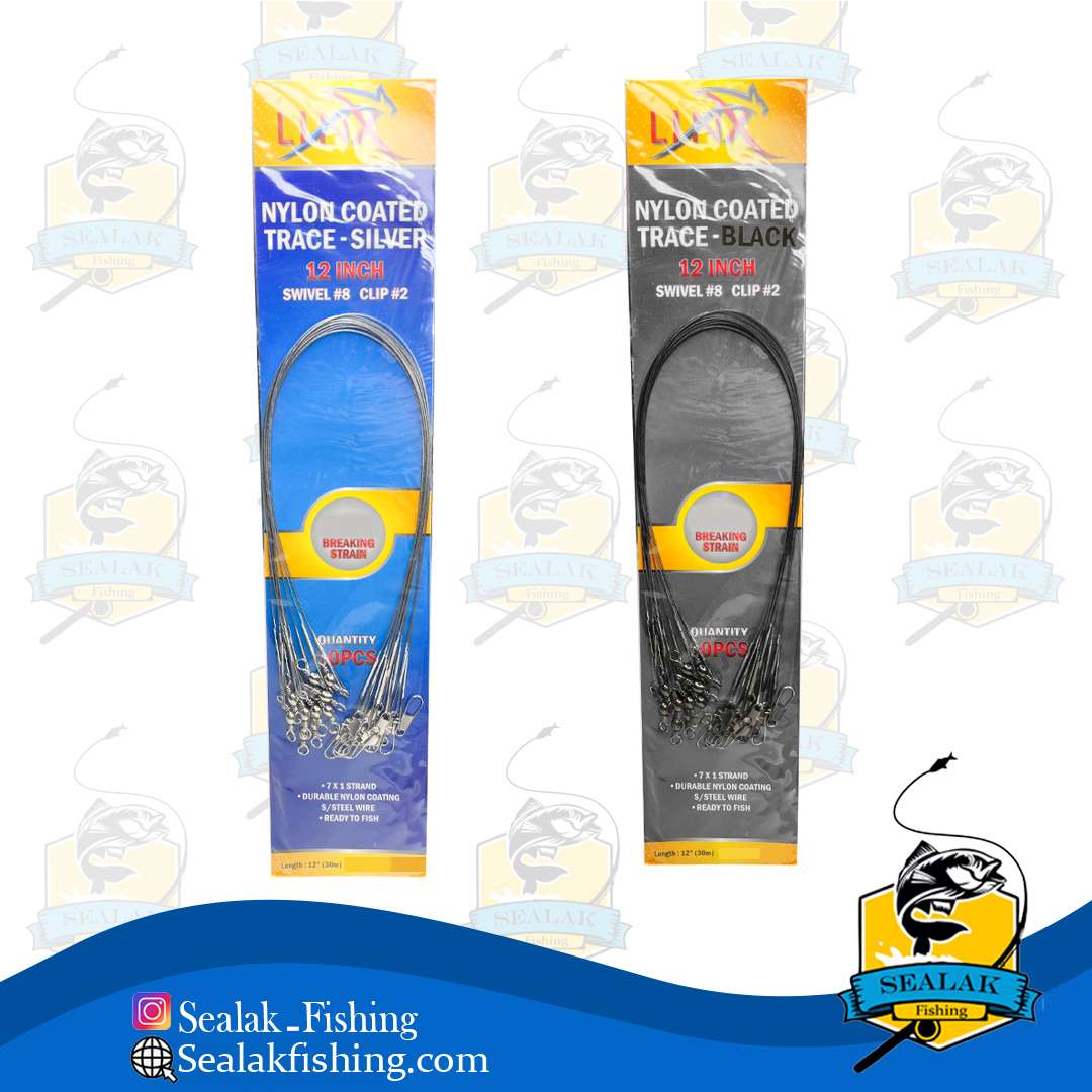 سیم لیدر Nylon Coated Trace از جنس استیل ضد زنگ به صورت 7 رشته ای ساخته شده است که جهت افزایش طول عمر سیم یک لایه نالیونی بر روی آن قرار داده شده و به صورت یک تک رشته نشان داده می شود . این محصول دارای سایزها ، تحمل وزن و رنگ های تفاوتی است که ماهیگیرمی تواند نوع دقیق و کاربردی را با توجه به نیاز خود انتخاب نماید . سایزهای سیم شامل 6 اینچ (15 سانتی متر) ، 9 اینچ (23 سانتی متر) و 12 اینچ (30 سانتر متر) ، تحمل وزن 20 پوند (9.1 کیلوگرم) ، 30 پوند (13.5 کیلوگرم) و 40 پوند (18.1 کیلوگرم) که در دو رنگ مشکی و نقره ای در بسته بندی 10 عددی (هر بسته دارای یک سایز خاص) عرضه شده است .