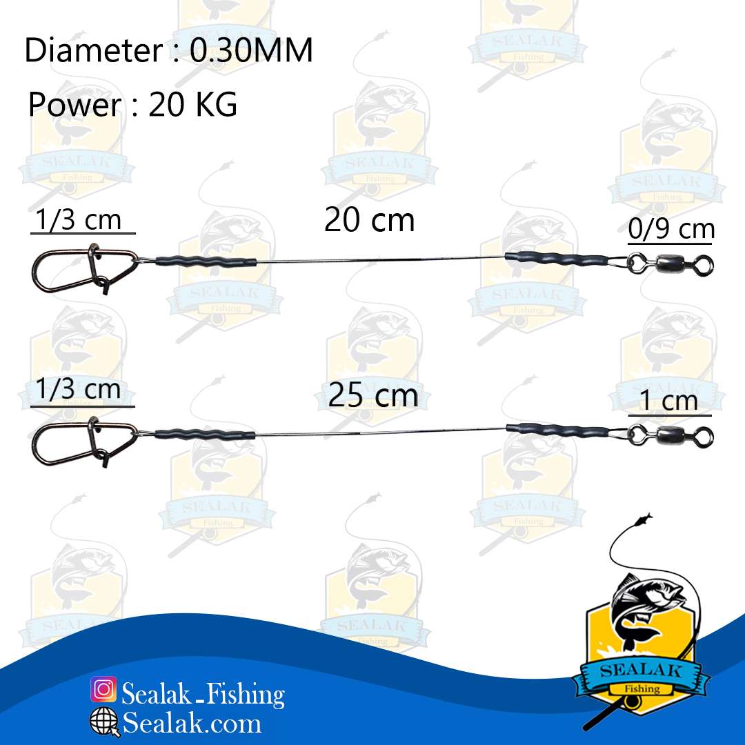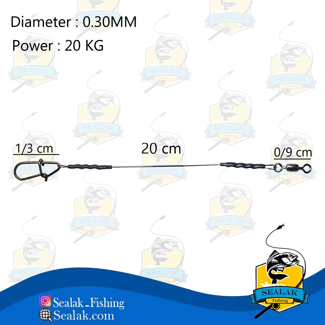 این محصول به صورت حرفه ای و تخصصی برای ماهیگیری به روش جیگینگ و اسپینینگ در دو سایز 20 و 25 سانتی متر ساخته شده که قابلیت استفاده برای ماهیگیری به روش انتظاری به ویژه برای صید در نزدیک سواحل و محل های صخره ای که احتمال پاره شدن نخ زیاد می باشد ، را بدون محدودیت دارد .همچینین در برابر دندان های تیز ماهیان مقاوم است و دچار پیچش و شکستگی نخواهد شد .  ضخامت این سیم 0.30 میلی متر با تحمل وزن 20 کیلوگرم می باشد که در یک سوی آن ، هرزگرد جهت اتصال به نخ اصلی و در طرف دیگر چفتی به منظور اتصال و همچنین تعویض سریع قلاب ، جیگ و لور قرار گرفته است .