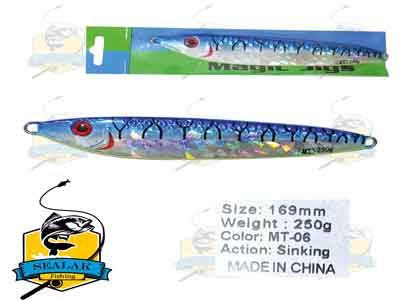 این محصول در اشکال و رنگ های متنوعی طراحی و عرضه است که همگی آنها برای ماهیگیری در دریا ، نزدیک زیستگاه های طبیعی و مصنوعی کارایی بسیار خوبی دارند . این محصول از برند بسیار خوش نام MT می باشد که تمامی محصولاتش از کیفیت بسیار بالایی برخوردار است که تمامی ماهیگیران با عملکرد خارق العاده آنها آشنایی دارند . این محصولات در رنگ های متنوعی از قبیل آّبی-کمر تیره (کد MT-02) ، سبز-کمر برجسته (کد MT-04) ، آبی – بدنه براق (کد MT-06) ، کله صورتی – بدنه راه راه آبی و فسفری (کد MT-13) می باشد .