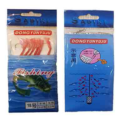 Sabiki rig شامل 6 عدد قلاب با سایز متوسط می باشد که به وسیله رشته نخ های بی رنگ با ترتیب خاصی با فاصله معین از یکدیگر ، به رشته نخ اصلی متصل شده اند . به مجموعه این ریسه ها و قلاب ها ، شش پر ، حشینه گیر ، پشمکی یا ریسه های سابیکی گویند . این محصول دارای انواع گوناگونی می باشد . در سایز ، رنگ ، نوع ریسه و همچنین نوع پرها تفاوت بسیاری دارند . قلاب ماهیگیری سایز 18 مدل Sabiki Rig دارای رنگ پر قرمز می باشد.