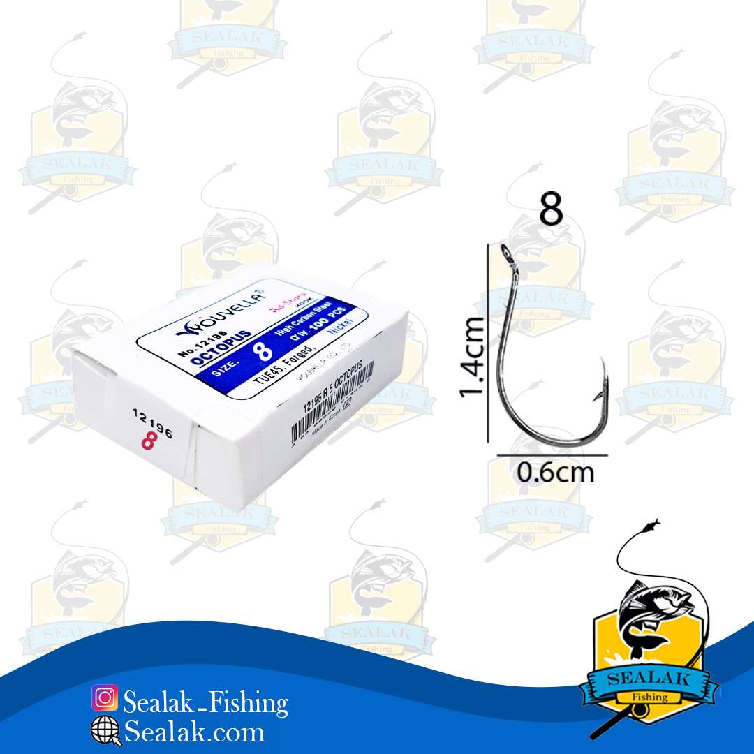 قلاب ماهیگیری سایز 8 کد Youvella-12196 مدل پایه کوتاه از نوع قلاب های دایره ای است که باعث افزایش شانس زنده ماندن ، ماهی های آزاد شده توسط ماهیگیر می شوند . با توجه به مطالعات صورت گرفته بر روی بسیاری از گونه های ماهیان صید شده ثابت شده که بعد از رها سازی بسیاری از آنها زنده می مانند. این قلاب ها اکنون به طور فزاینده ای برای ماهیگیری تفریحی در مکان های مختلف مورد استفاده قرار می گیرد .