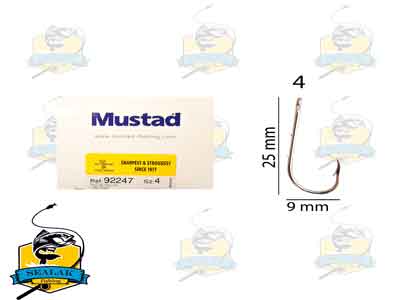 قلاب ماهیگیری شماره 4 مدل Mustad-92247  از سری قلاب های منقاری (نوک بلند) نگهدارنده طعمه (Bait Holder) می باشد که دارای خارهای اضافی بر روی پایه است تا طعمه را بهتر در موقعیت خود نگه دارد و نوک قلاب را بپوشاند. این قلاب برای استفاده همراه با کرم های خاکی و ژله ای کوچک ، خرچنگ ها و تکه های ماهی و حتی طعمه های زنده بسیار عالی می باشد. نوک قلاب معکوس (کج) شده و شرایطی را فراهم نموده است تا نوک قلاب با کوچک ترین تماس و نوک زدن ماهی به دهان ماهی فرو رود و نیازی به تقه وارد نمودن نباشد.