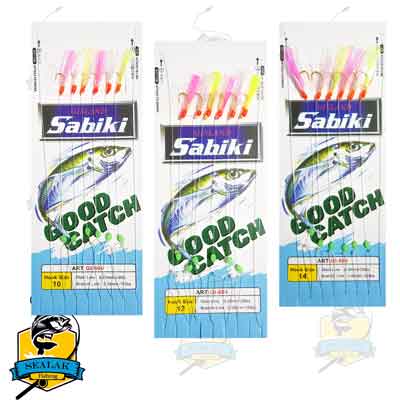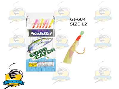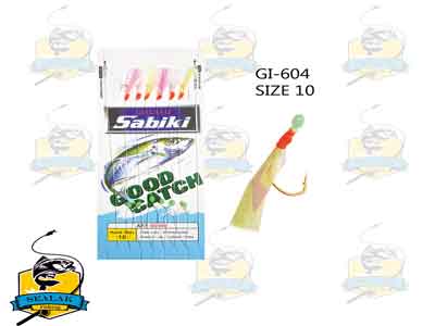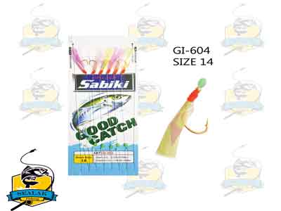 قلاب ماهیگیری Sabiki مدل Good Catch-604-A به دلیل طراحی خاصی که دارد گزینه های زیادی (قلاب های متعدد) را جهت تحریک ماهی برای حمله به قلاب ها جهت صید غذا ارائه می کند . استفاده از پرها و ریسه های براق و رنگی موجب شده تا این رشته قلاب ها برای صید ماهیان کوچک عملکردی عالی داشته باشند . قلاب های سابیکی از بهترین لوازم صید ماهیان زنده جهت استفاده بعنوان طعمه در صید ماهیان بزرگ محسوب می گردد .